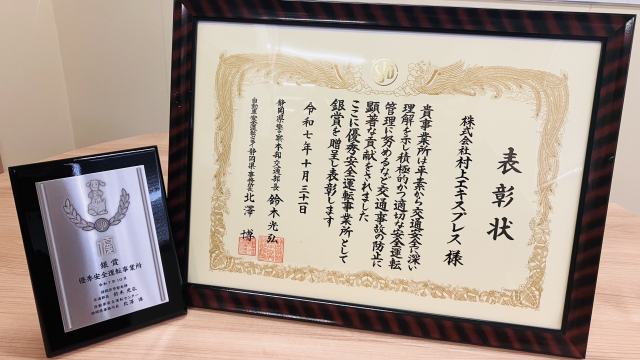 2025年11月6日 弊社は静岡県警察交通本部、自動車安全運転センター様より静岡県中央警察署にて「優秀安全運転事業所」銀賞を受賞、表彰を受けました。